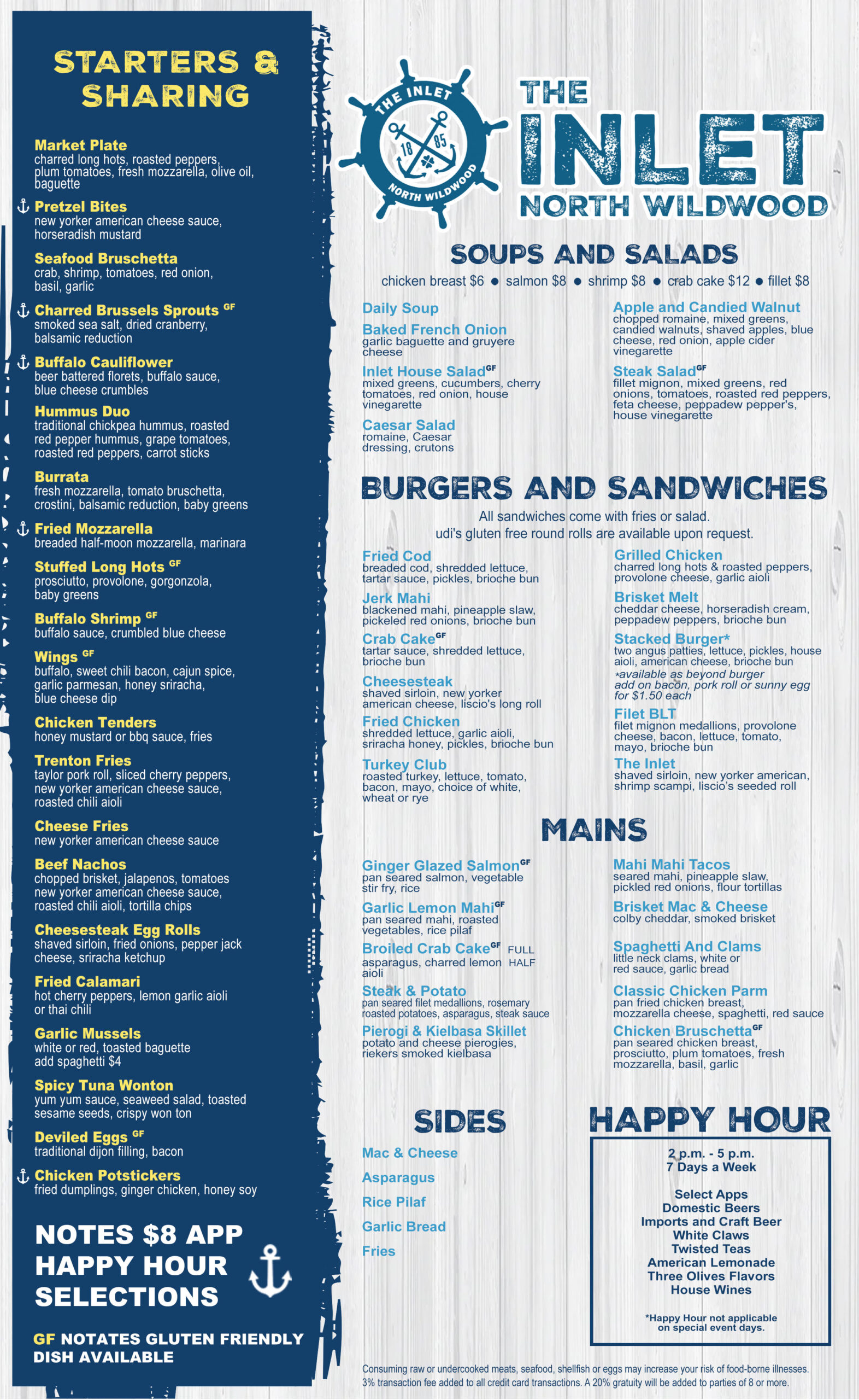 Items with ⚓ are selections on our $8 happy hour appetizer menu. Items with a star are Inlet favorites!